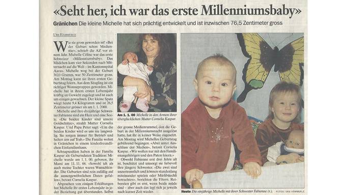 Berühmt wurde in dieser Nacht schweizweit aber jemand anderes. Die Gränicherin Michelle Kaspar war das erste Neugeborene im neuen Jahrtausend. Um genau fünf Sekunden nach Mitternacht am 1.1.2000 hat sie im Kantonsspital Aarau das Licht der Welt erblickt. Sogar die Tagesschau berichtete über die Geburt:
